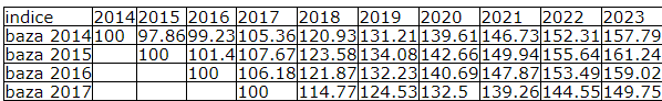 c) coeficienții de creștere a costurilor în construcții inginerești pentru fiecare an (coeficienți publicați de către Institutul Național de Statistică pentru perioada 2015-2019 și în funcție de prognoza realizată de către Comisia Națională de Strategie și Prognoză pentru 2020-2023), din tabelul următor: